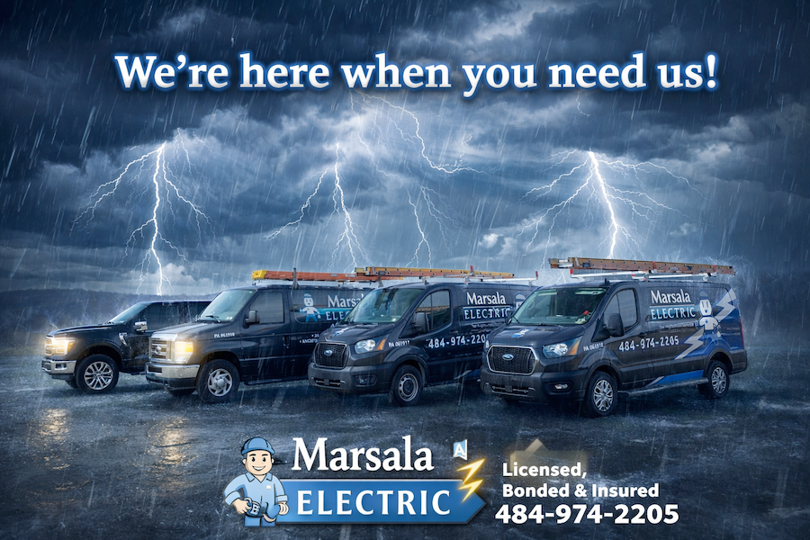 Among our many services offered, we can be of service 24 hours a day for an emergency and come within the hour. Marsala Electric services southeastern Pennsylvania in Montgomery, Bucks, Chester & Philadelphia counties. Call today for a free estimate or inspection at 484-974-2205 or email info@marsalaelectric.com.